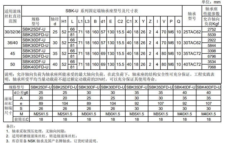 我司专业研发和生产世界著名厂商全型号滚珠丝杠专用精密轴承座,并在国际通用型号基础上,首创了TAC系列重载精密滚珠丝杠专用轴承座。各产品型号与台湾嵩阳SYK,日本THK,日本NSK,MISUMI,德国Rexroth相应型号通用。SBK系列具体型号:SBK25DF-U、SBK25DFD-U、SBK30DF-U、SBK30DFD-U、SBK35DF-U、SBK35DFD-U、SBK40DF-U、SBK40DFD-U